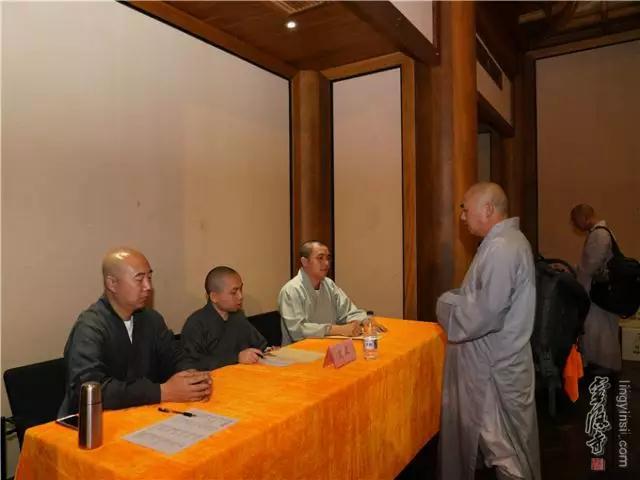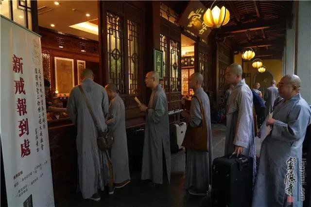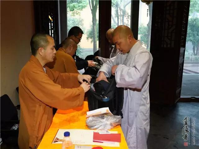 4月23日,来自全国各地的300多名新戒正式报到。新戒按规定登记个人信息、接受行李检查和五堂功课的考核、领新戒证、将通讯工具及个人贵重物品寄存、领取戒期所需的衣、钵、具等物品。灵隐寺传戒法会的报到登记,严格按照戒子审核要求执行,不合格者不予登记入单。