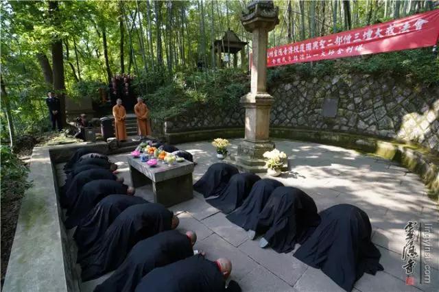 5月11日,三师七证齐聚灵隐,在开堂大师父芳振律师及诸引礼师的带领下,戒子们迎请十师至紫竹广场,设斋供养十师。戒子们恭聆法教 法喜充满。