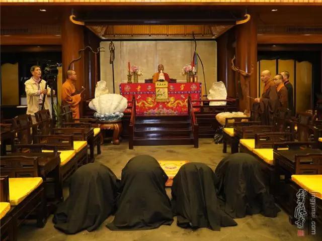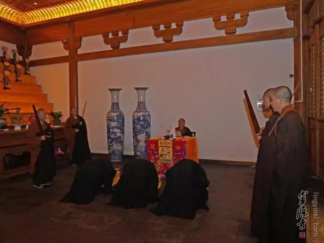 5月2日新戒弟子在开堂大师父芳振律师及引礼师的引导下,本堂发露,拜愿忏悔。发露时,新戒一般都会受到引礼师香板的警策,用香板消除新戒的无量业障。