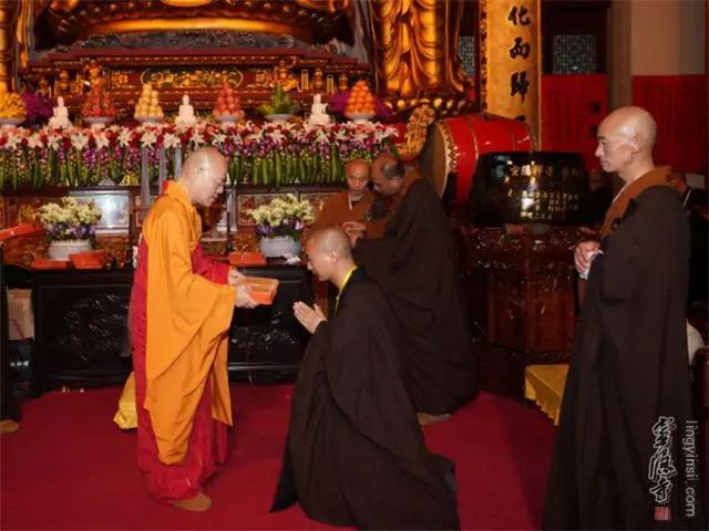 5月12日,戒子们迎来了等待已久的殊胜时刻——二坛正授比丘戒。灵隐戒场,法幢高悬,钟鼓齐鸣,佛号声声,梵呗悠扬。在庄严仪仗的礼请之下,"三师七证"依次登入戒坛,展和合具,普礼三拜,以表"大众和合无违诤,是乃可得同受戒"之佛制。三百多名戒子,三人一组,共百来坛,由引礼师依次带领登比丘戒坛,回答诸种遮难等问题。在征询七尊证阿阇黎同意后,得戒大和尚为其正授比丘戒。"正授比丘戒"延续两天圆满。