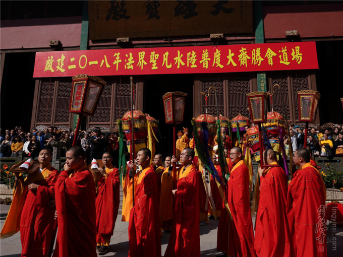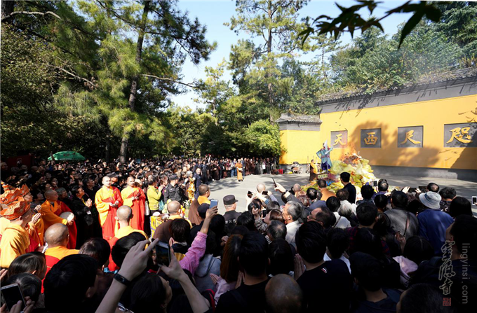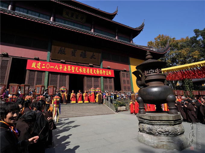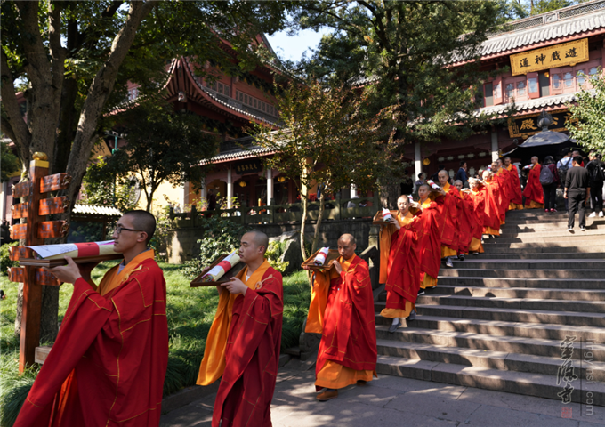 2018年10月27日(农历九月十九),观世音菩萨出家日,杭州灵隐寺戊戌"法界圣凡水陆普度大斋胜会"圆满送圣。清晨,灵隐寺两序大众、善信居士会聚大雄宝殿参加观音菩萨出家日祝圣普佛,共祈吉祥。上午,大坛药师殿分别举行了水陆法会延生普佛、往生普佛;与此同时,内坛畅演水陆胜会圆满供、圆满香、送判宣疏、送圣等法事。中午举行圆满斋活动。下午,内坛和外坛功德主再次齐聚大雄宝殿,参加水陆法会最后一场仪式——"圆满送圣"。