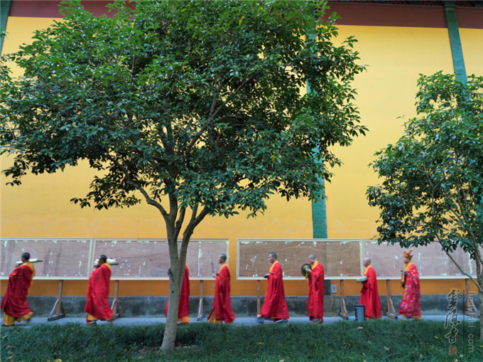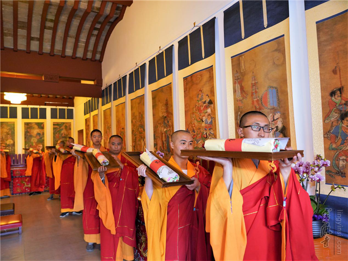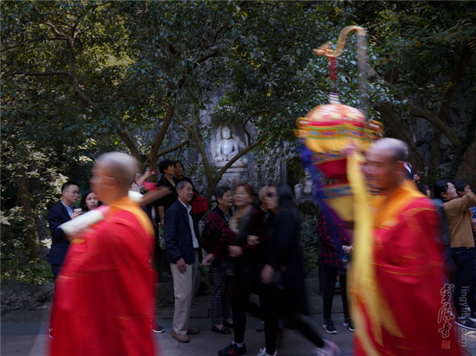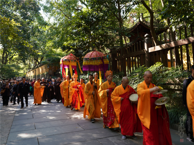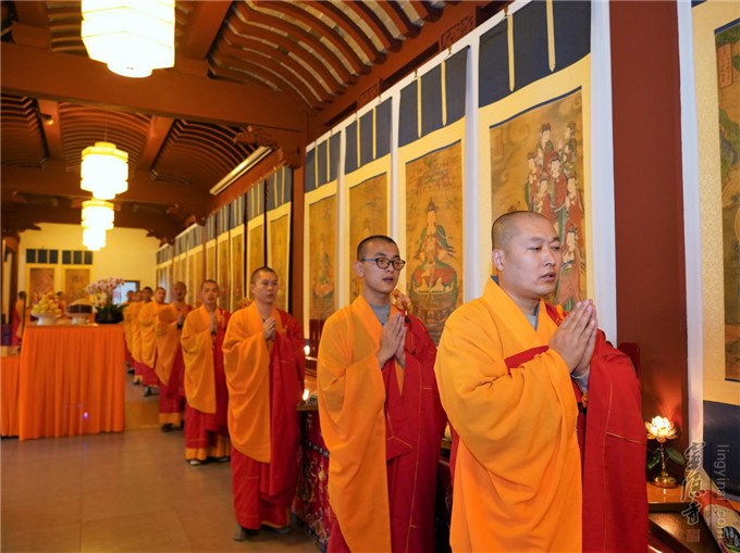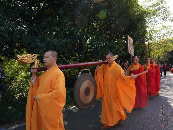 法鼓声声,梵呗阵阵。法器在念佛引导声中,监院心如法师领班开道。主法法师、正副二表法师带领大众奉送圣驾。