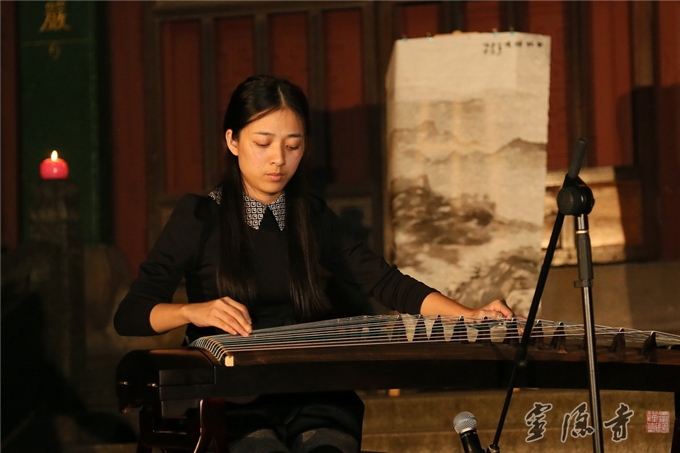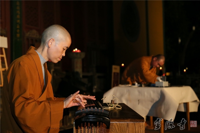 云林茶会现场,法师居士们相继登台,为茶会来宾供养梵音和书法艺术。智仪法师演绎的《梅花三弄》旋律优美流畅,栩栩如生再现了凌霜傲雪梅花的高尚品格。净立法师的《寒鸦戏水》以轻盈的旋律、清新的格调、别致的韵味,再现寒鸦在水中嬉戏的情趣。杨馨宇居士的《高山流水》其韵悠悠扬扬,俨若行云流水,表达了高山流水的豁达心境……