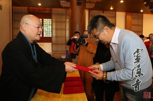 光泉大和尚(中)与冠军自愚法师、张越然合影留念