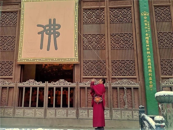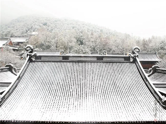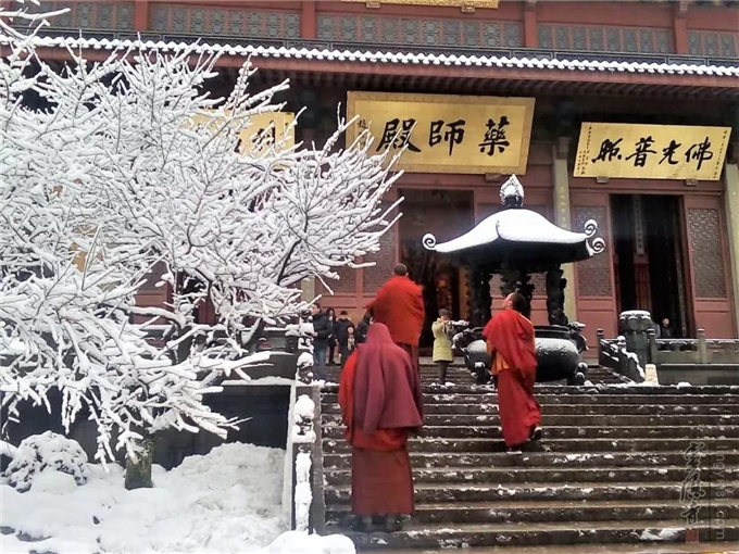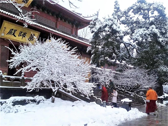 在药师殿前我看见了一群喇嘛,估计是来灵隐寺学习交流的。他们穿着的服饰,在白雪皑皑的寺院里非常夺目。我赶紧拍了几张照片发到朋友圈。朋友看见了,也急冲冲赶到灵隐寺。
