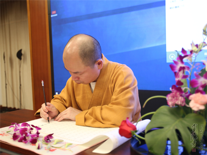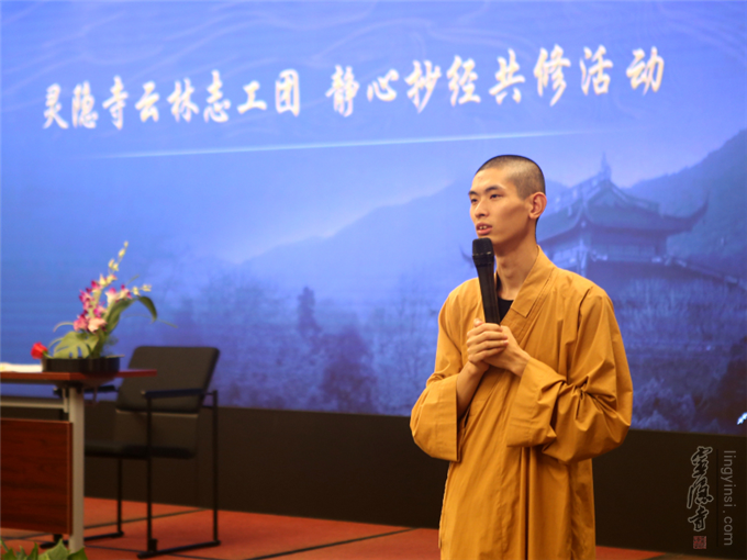 共修开始之前,能量法师以"戒定慧"三学来开示大家抄经的利益功德。首先抄经是一字一佛,现代人节奏快、压力大,所谓"浮世本来多聚散,红蕖何事亦离披?"七月流火日,华阁清凉地,籍以虔诚静心抄写佛经,投入身心之全部力量,则能收摄大众的散乱心,集中精神,进而断除各种杂念,使心境清净平和,制心一处、无事不办。