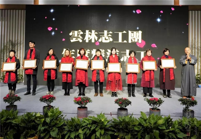 在2019年云林志工团新春联谊会上,十位"年度精进志工"受到表彰。他们分别是:正念组的朱晓霞,精进组的王旭颖,法喜组的戚坚如,轻安组的杨芳芳,舍离组的徐水荷,禅定组的陶红萍、来根梅,正念组的赵岚、方海棣,大殿组的吴彦辉。光泉大和尚给十大"年度精进志工"颁发荣誉证书。