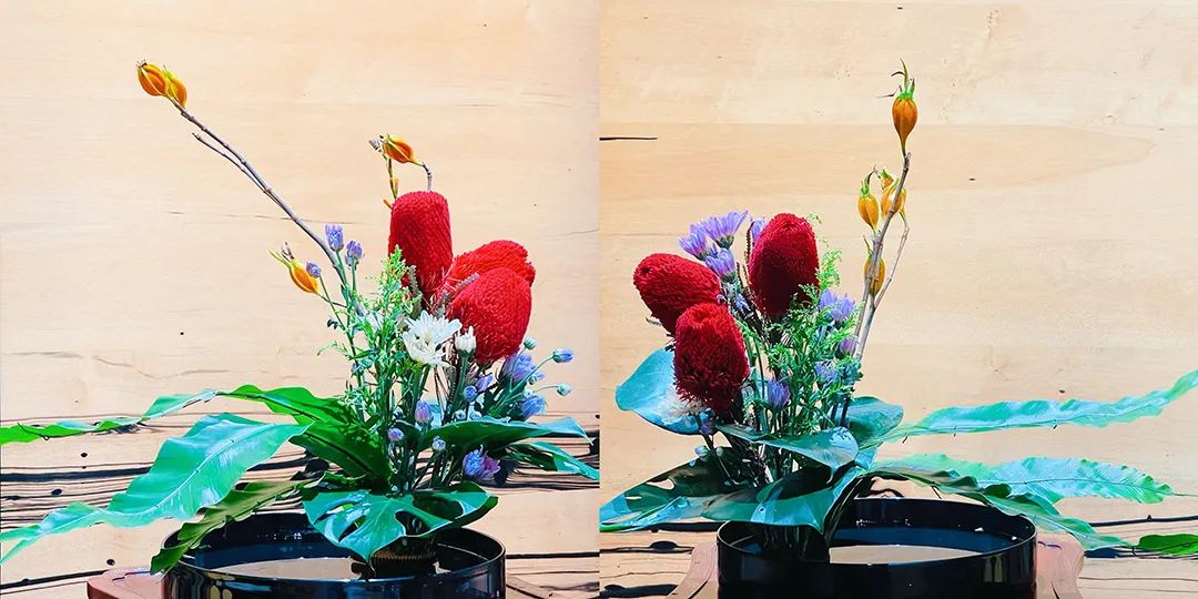 在老师指导下我们的作品清雅流畅,充分按植物生长的自然形态,用直立、倾斜、平出和下垂等不同的插花形式,呈现出一个个表达自然美和生活美的作品。