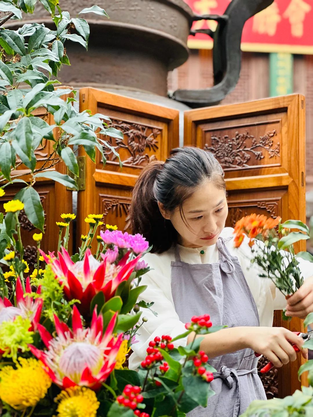 老师、师兄们专注、认真、平和的神情最让人感动。这枝头累累的作品充满了朴实之感,不矫揉、不造作,给人一种成熟又层次丰富的感觉,无论是花朵色彩上的深沉、灵动、复古、温暖、高级,充满了禅意和平静的力量,每一帧都犹如油画般浓烈和高雅,这花朵和果实自带的丰收感,令人赏心悦目,在寺院里更增添了秋日独有的魅力和禅意,演绎着自然花木之灵秀,更传递着中华民族传统文化精神的写意之境。
