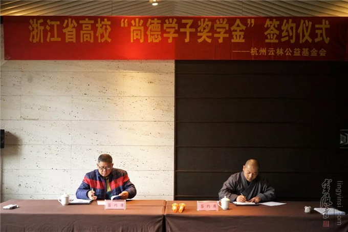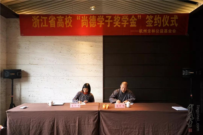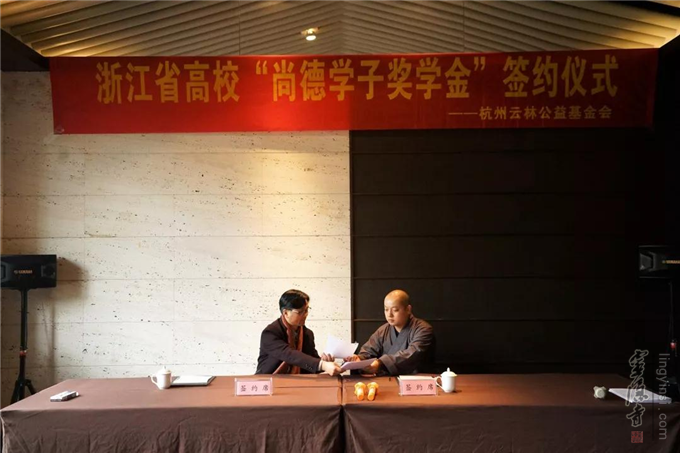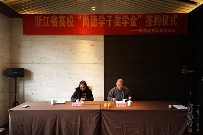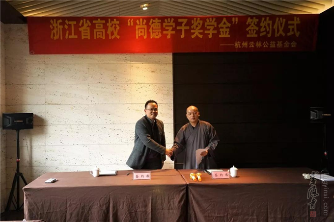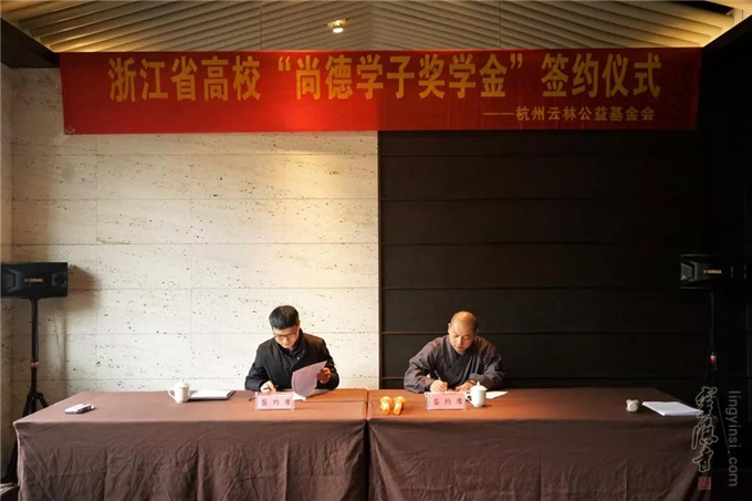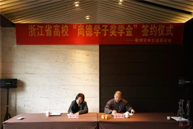 2018年12月13日,杭州云林公益基金会举行了浙江省高校"尚德学子奖学金"签约仪式。杭州市民族宗教事务局宗教处处长胡胜军、杭州灵隐寺监院智光法师、杭州云林公益基金会常务副理事长圣贤法师以及浙江大学、浙江工业大学、杭州电子科技大学等8所高校的代表出席了签约仪式。
