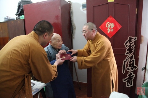尊老爱老,是佛教的优良传统,佛陀就曾经慈悲地为年老比丘穿针。为了更好地弘扬这种传统,传播佛教慈悲和感恩的精神,2014年3月29日下午,灵隐寺杭州云林基金会、功德会的法师和云林志工团义工们自发组织起来,购买了大豆油、米等生活物品,发心前往上天竺法喜寺的"安养堂",看望和慰问在这里安身养心的老法师们。