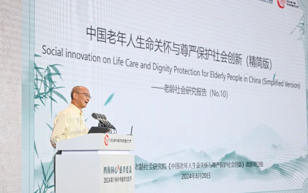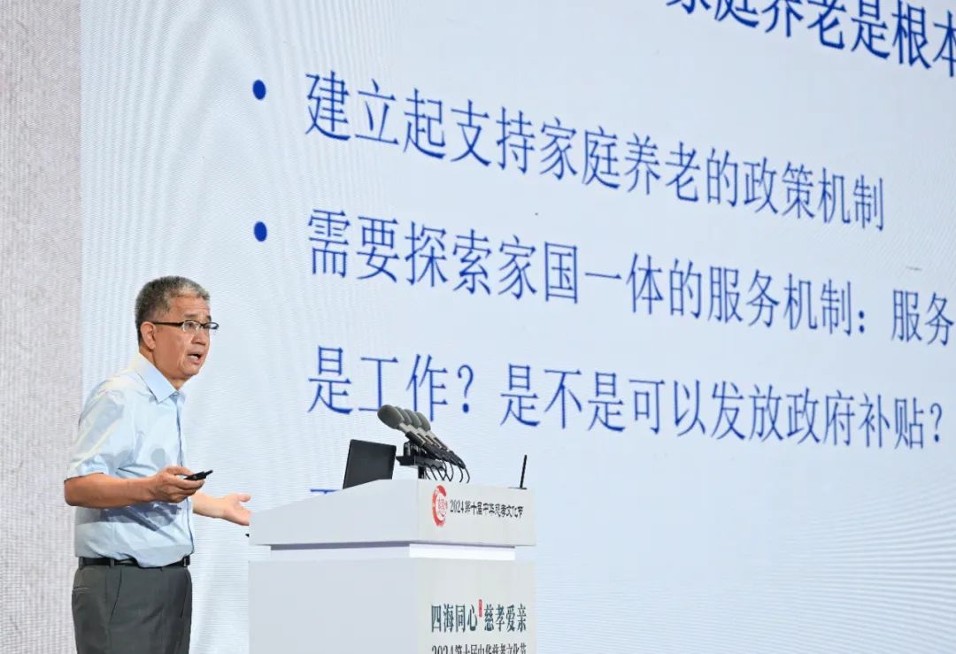北京师范大学中国公益研究院理事长、创始院长,民政部原社会福利和慈善事业促进司司长王振耀,作了题为《孝慈文化与中国养老服务业前途》的主旨演讲。他从哈佛大学关于孝文化的课程引入,讲述了迎接老龄社会所需要的公共伦理,以及中国老龄产业与养老服务业的发展方向。王振耀对如何推动社会养老服务的创新与发展的深入探讨,揭示了新质生产力在养老服务中的重要作用,提供了宝贵的启示和思考。