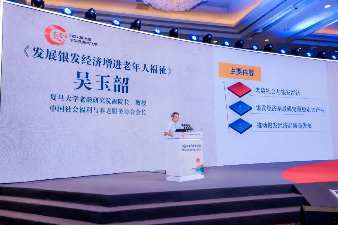 复旦大学老龄研究院副院长、教授,中国社会福利与养老服务协会会长吴玉韶,带来了题为《发展银发经济增进老年人福祉》的主旨演讲。他提出,银发经济是最确定最稳定的大产业,推动银发经济高质量发展,要坚持新理念引领、坚持长期主义、坚持需求导向、坚持创新驱动、坚持“四化”发展、坚持要素支撑。