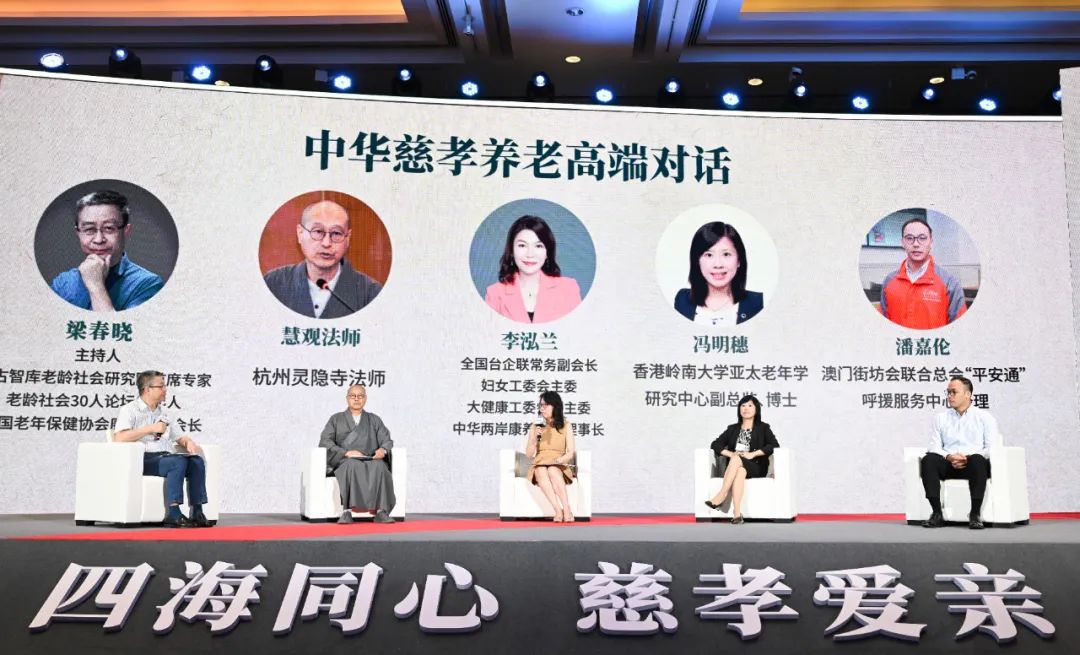 在主题研讨环节,杭州灵隐寺慧观法师;全国台企联常务副会长、中华两岸康养协会理事长李泓兰;香港岭南大学亚太老年学研究中心副总监、博士冯明穗;澳门街坊会联合总会“平安通”呼援服务中心经理潘嘉伦对慈孝养老有关问题分享了自己的经历与看法。