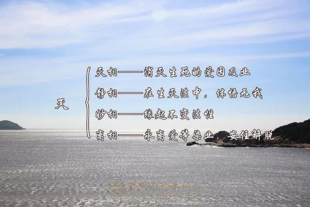 灭谛亦有四种行相,灭相、静相、妙相、离相。灭相:生死业因灭尽无余。静相:在生灭法中,体悟无我。妙相:于诸烦恼苦,究竟离系,净妙无喻。离相:出众过患,永离爱等染业,安住解脱。