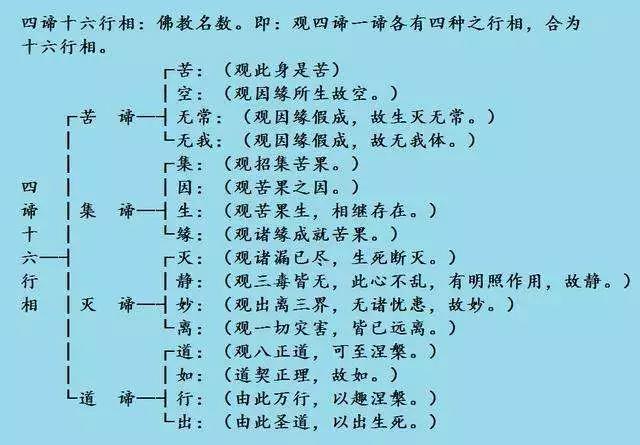 四谛为世间、出世间、生死、涅槃的因果。苦为迷果——示相,集为迷因——追源,此二为世间生死流转的因果;灭为悟果,道为悟因,此二为出世间还灭的因果。