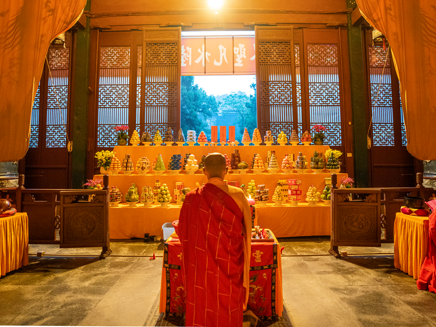 凌晨4时30分,灵隐寺大雄宝殿供台高矗,香、花、灯、水、果、茶、食、宝、珠、衣等“十供养”殊胜供品摆放整齐,辛丑水陆法会举行大坛斋天佛事。在高扬梵音声中,主法法师带领功德主虔心供养十方诸佛菩萨,依次礼敬护世诸天及其随从,祈愿护持,福佑十方。