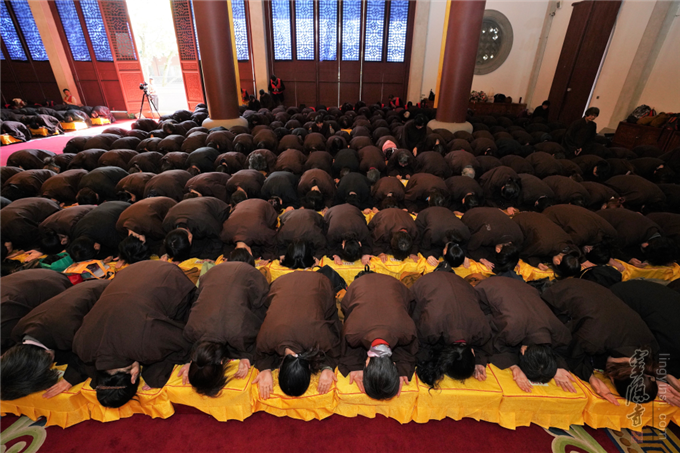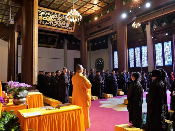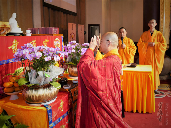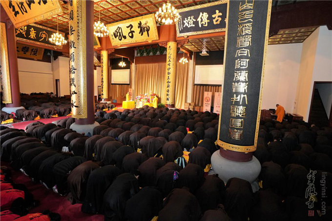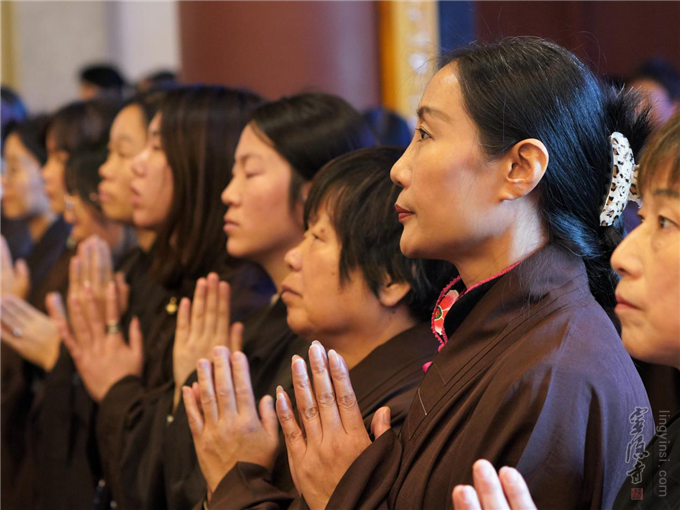 上午十点三十分,皈依法会正式开始。信众代表在法师的带领下迎请光泉大和尚。直指堂内善男信女分东西两班,合掌恭立,齐诵"南无本师释迦牟尼佛"圣号。