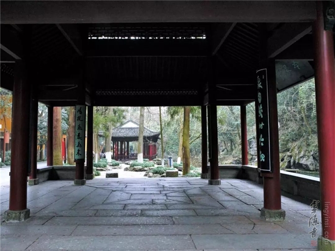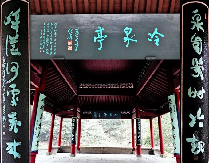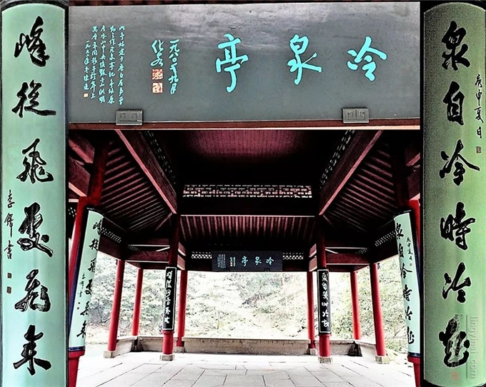 虽然冷泉亭移动位置,失去了往日的情致,但依然是游客必到之地。到了明代,冷泉亭上多了一副对联,写道: