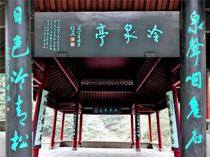 现冷泉亭正面的楹联是:"泉声咽危石,日色冷青松。"著名书法家欧阳中石书。意为:流泉声咽,穿过峭立的崖石;日色清冷,照着浓荫的青松。该联出自王维《过香积寺》。