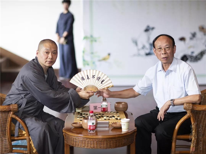 灵隐寺法师向对方棋手赠送光泉大和尚手书"见棋不是棋"折扇。