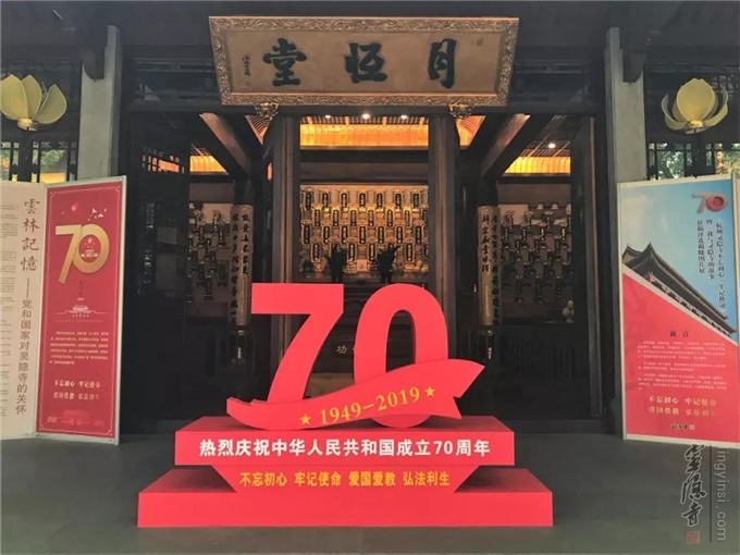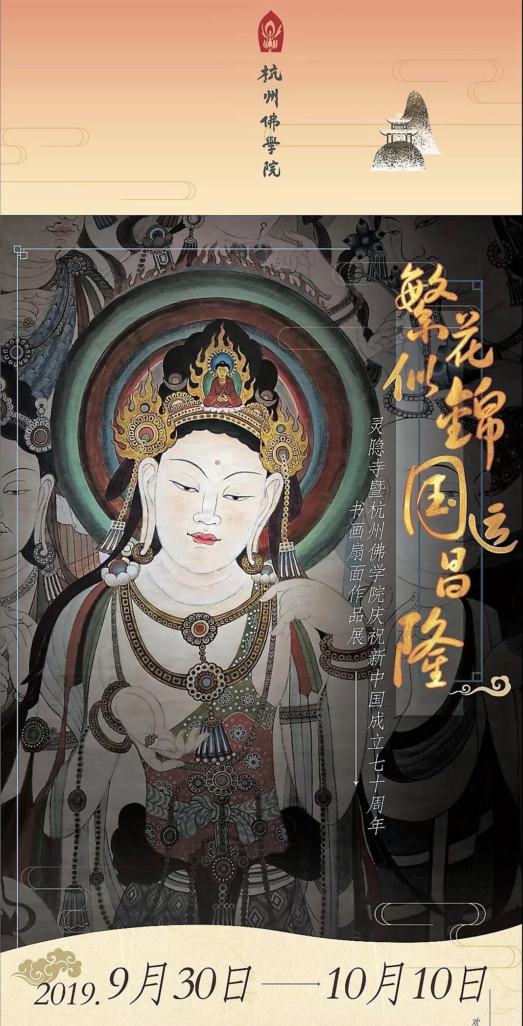 9月30日至10月10日,灵隐寺直指堂举办"繁花似锦·国运昌隆——灵隐寺暨杭州佛学院庆祝新中国成立70周年书画扇画作品展"。展览展出书画作品70幅,扇画70件,藉传统书画艺术,歌颂祖国,感念国恩,祈愿祖国昌盛、世界和平。
