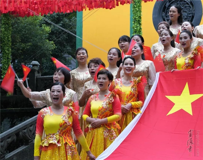 我和我的祖国,一刻也不能分割;无论我走到哪里,都流出一首赞歌。为庆祝新中国成立70周年,杭州灵隐寺云林志工团精心策划了与游客互动的快闪活动。艺术团志工换上节日盛装,聚集到了大雄宝殿前,周围的游客受到感染,围拢在快闪人员的身边,一起歌唱祖国,同庆七十华诞。