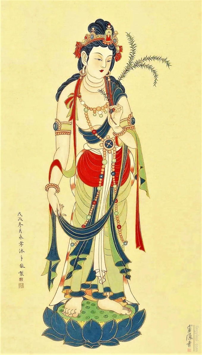 观音菩萨能体察到众生的苦痛,常常以瓶中的甘露水遍洒世间,使在热恼中的一切有情皆能获得清凉滋润,心生欢喜。