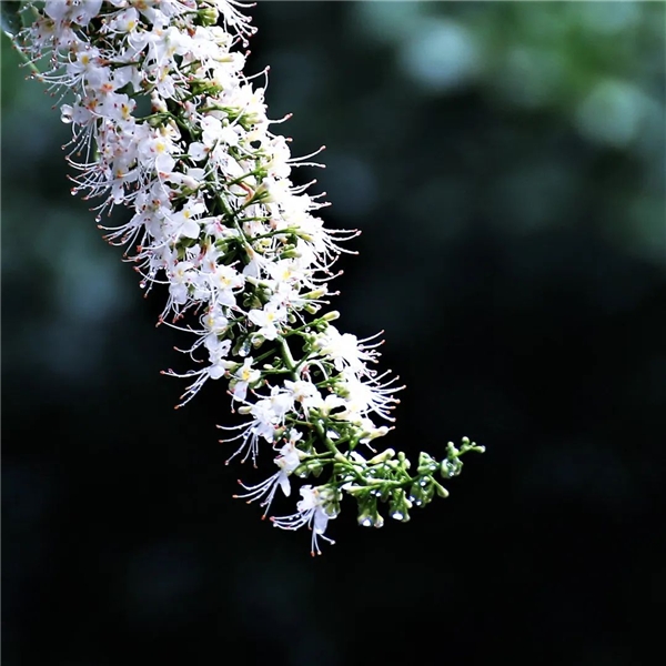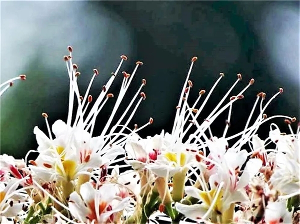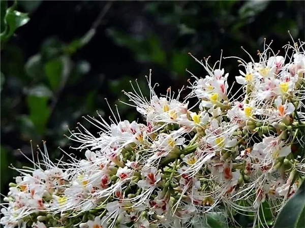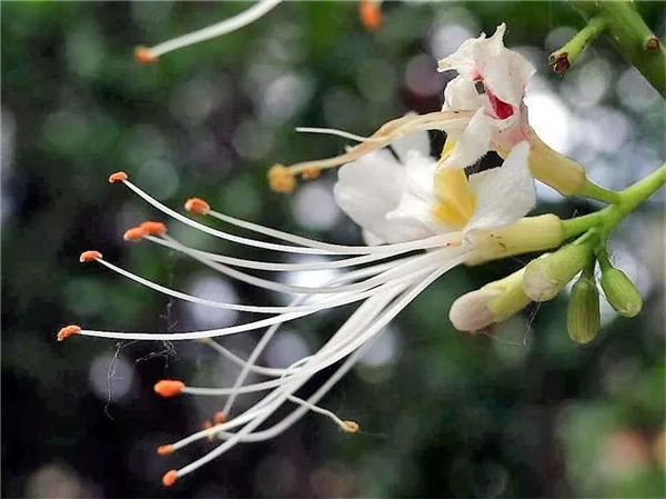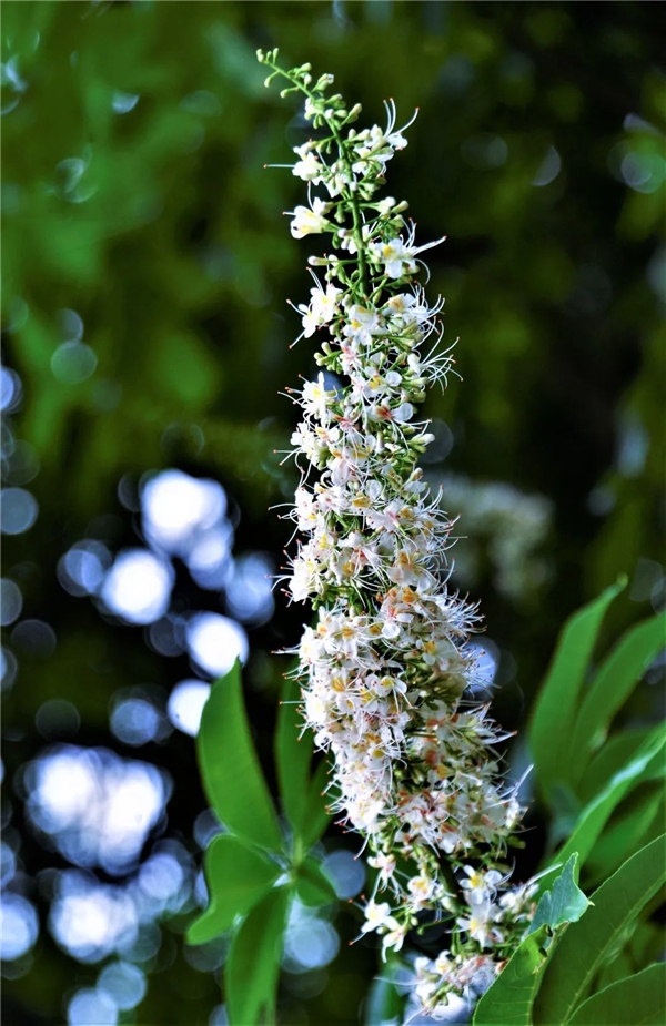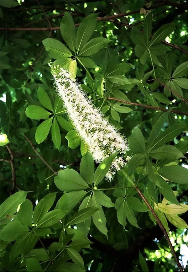 娑罗树,树干耸直,冠大幽浓,七叶轮生,犹如手掌,让人联想轮回。更神奇的是近百朵蛋白色小花簇聚在圆柱塔形的花序上,远远望去,整个花序白中泛紫,象是蒙上了一层薄薄的面纱。每朵花的花瓣是四片,花蕊是七根,长3厘米,丝线状 。每根花蕊都顶一个橘红色的卵圆形精灵,争相接受雨露和阳光而孕育硕果。
