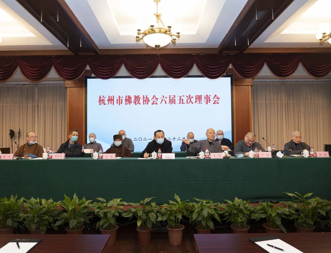 2021年1月22日上午,杭州市佛教协会第六届五次理事会在灵隐寺华严阁召开,杭州市佛教协会会长光泉法师,名誉会长定本法师,常务副会长月真法师,副会长智圆法师、戒兴法师、戒清法师、念顺法师、演通法师、印旭法师、惟尘法师及全体理事参加会议。杭州市民宗局党组成员、二级巡视员周晓明,宗教处处长胡胜军等有关领导莅会指导。会议由市佛协副会长戒兴法师主持。