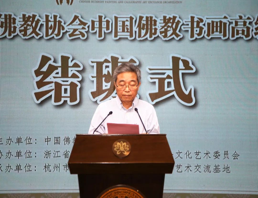 杭州市民族宗教事务局党组副书记、副局长唐明壮,杭州市民族宗教事务局宗教处处长胡胜军,中国佛教协会副会长心澄法师,中国佛教协会副秘书长宏度法师、全柏音、光泉法师、秋爽法师、隆相法师,中国佛学院教务处主任理证法师,中国佛教协会艺术委员会副主任月真法师,中国佛教书画艺术交流基地办公室念顺法师等领导和嘉宾参加结班式。中国佛教协会艺术委员会副主任月真法师主持会议。