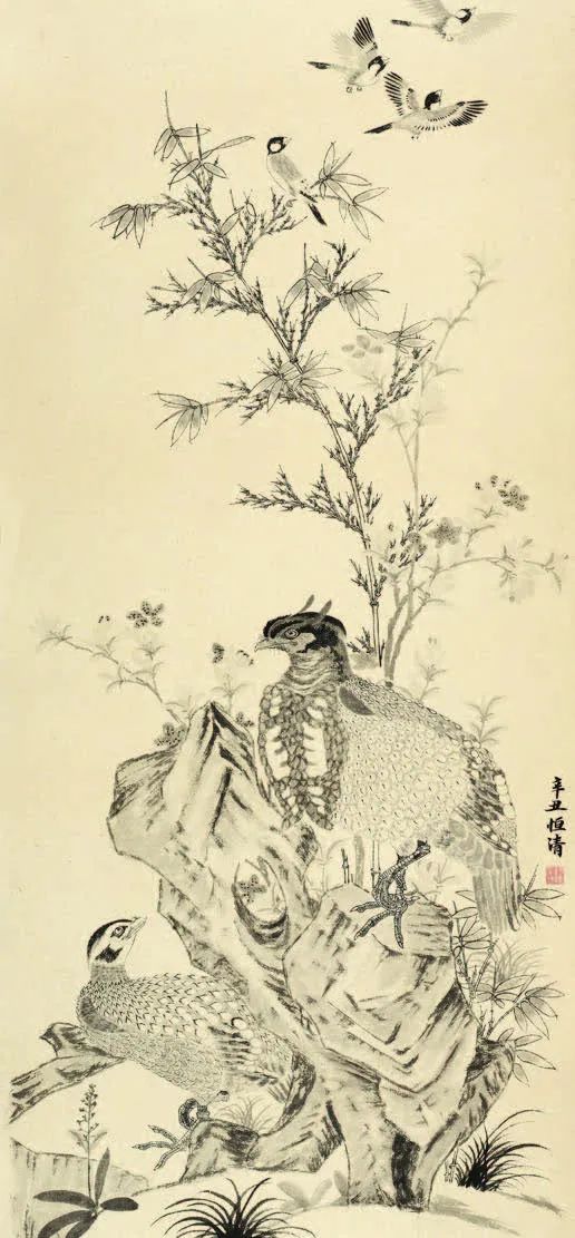 释恒清 竹石集禽图 120cm×56cm