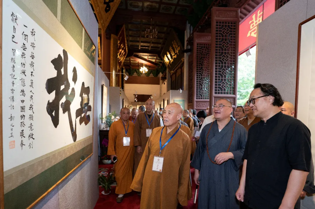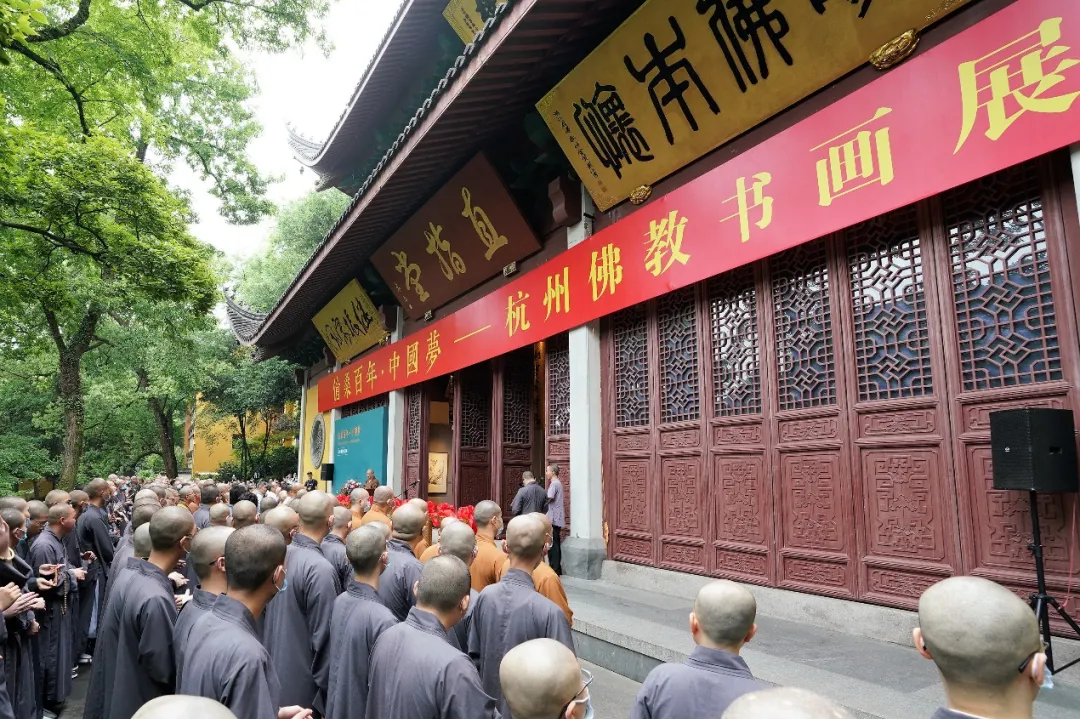 杭州市佛教协会举办的“沧桑百年·中国梦——杭州佛教书画展”在灵隐寺直指堂开幕,在杭参加中国佛教协会第十届理事会文化艺术委员会第一次会议的代表出席开幕式。