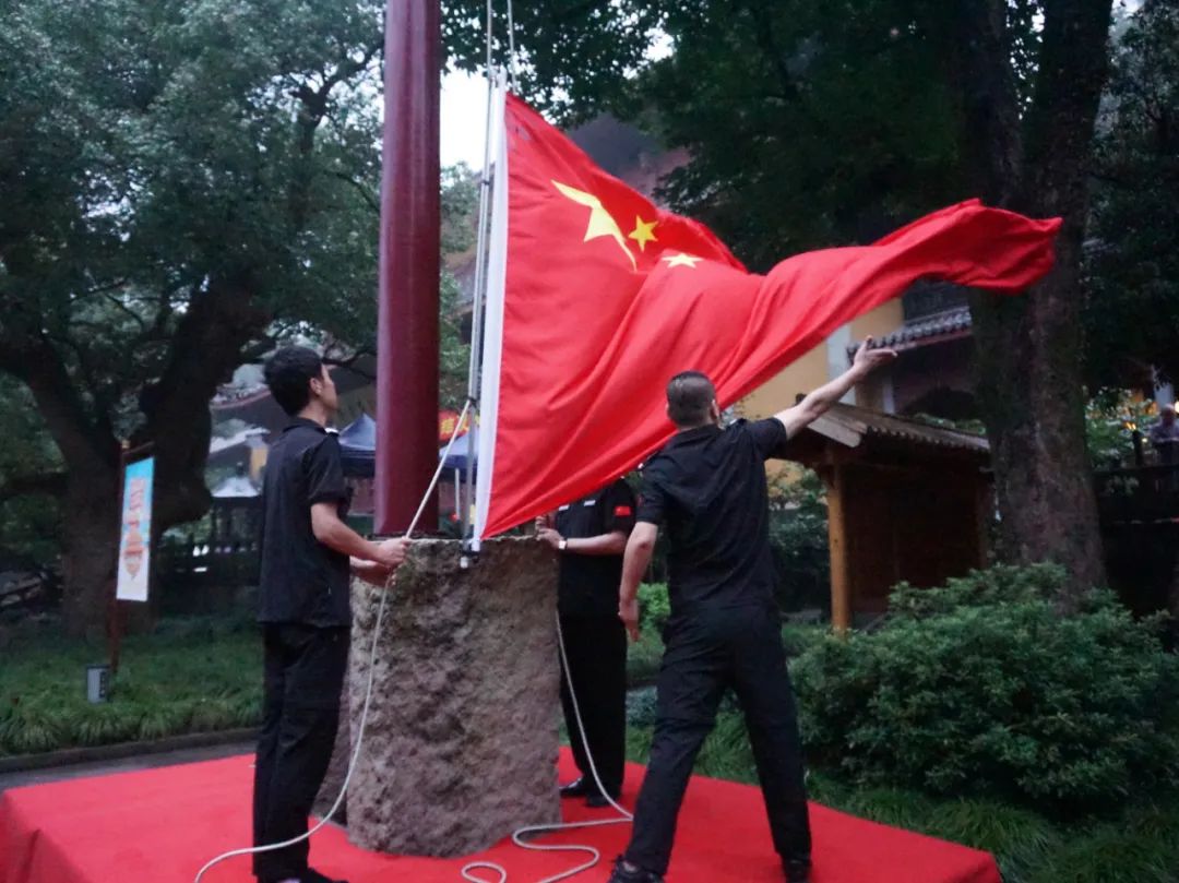 伴随着雄壮激昂的国歌声,鲜艳的五星红旗冉冉升起,光泉大和尚带领大家跟唱国歌,行注目礼。大众注视着国旗在灵隐寺上空高高飘扬,满怀崇敬之情献上对伟大的党、伟大的祖国的美好祝福,共同祈愿国家繁荣昌盛,人民安居乐业。