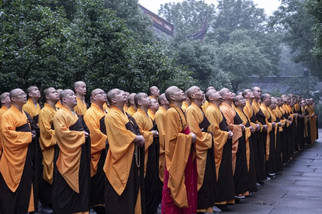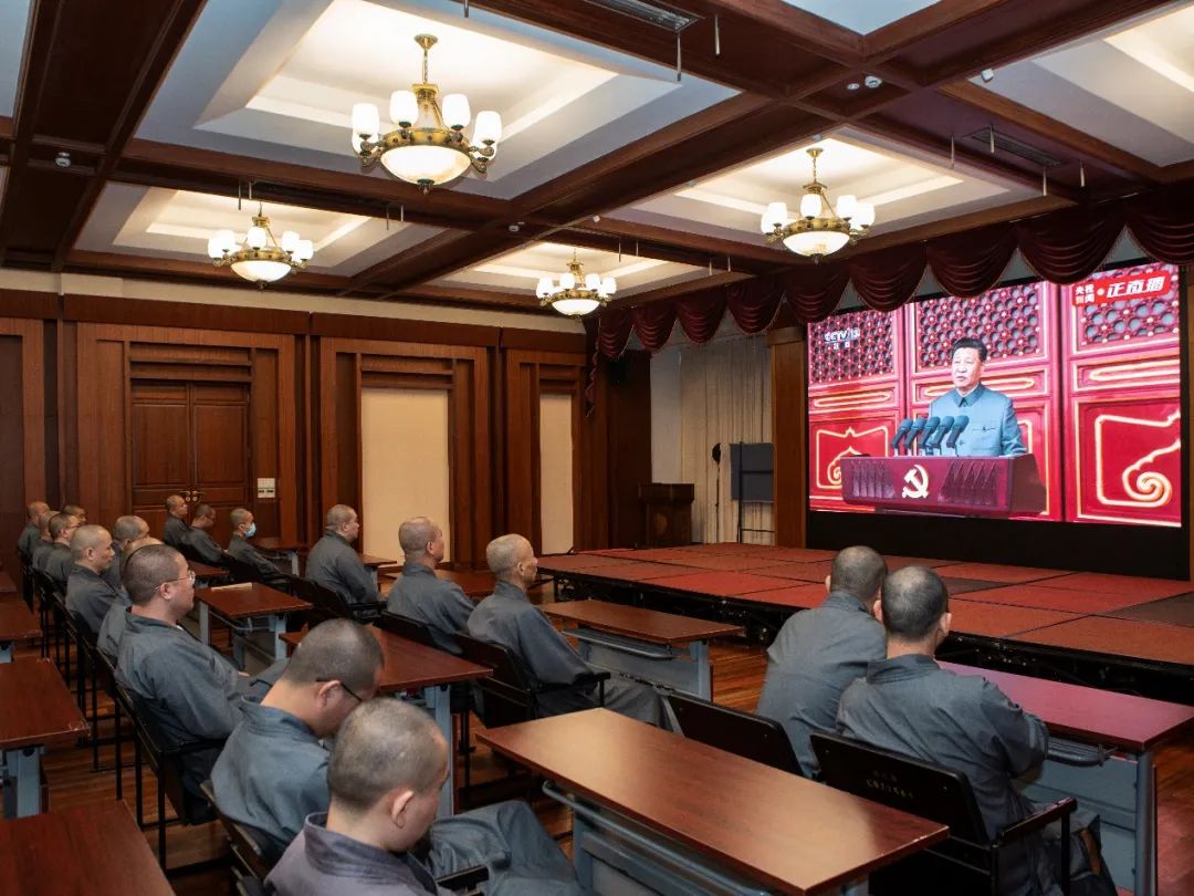2021年7月1日,庆祝中国共产党成立100周年大会在北京天安门广场隆重举行,灵隐寺组织寺院全体僧众在华严阁集体观看实况直播,认真聆听习近平总书记重要讲话。
