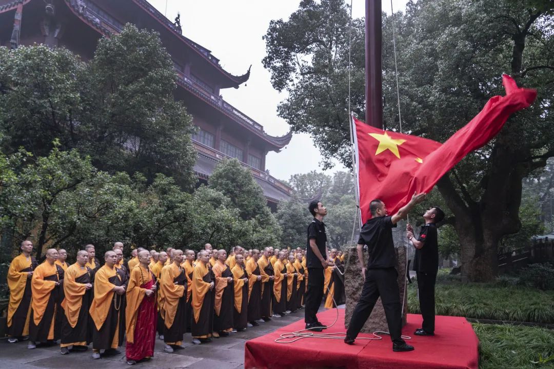 杭州灵隐寺于清晨举行庆祝中国共产党成立100周年升国旗仪式,方丈光泉大和尚率两序大众参加,满怀崇敬之情献上对伟大的党、伟大的祖国的美好祝福,共同祈愿国家繁荣昌盛,人民安居乐业。