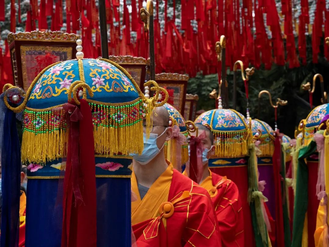 下午12时30分,辛丑水陆法会圆满送圣正式开始。仪仗队分别手持香、花、灯、乐、幢、幡、华盖,在大雄宝殿前东西排班站立。主法法师在内坛将供奉的牌位如法取下,置入信函封存。内坛功德主的法师的带领下,缓步行至大雄宝殿,礼敬诸佛。