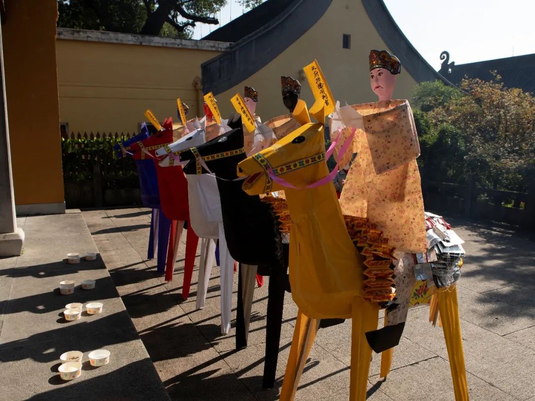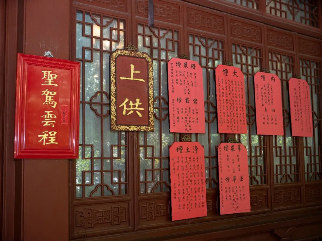 法鼓声声,梵呗阵阵,大众从大雄宝殿出发,提炉持幡,口称佛号,鸣锣开道,奉送圣驾。送圣队伍途经药师殿、“东南第一山”照壁、冷泉亭,最终至紫竹广场西方法船处,将内坛上、下堂疏楮、二十四席牌位及受荐亡灵牌位依次放入西方法船上。