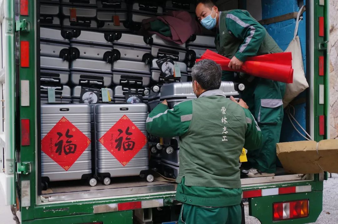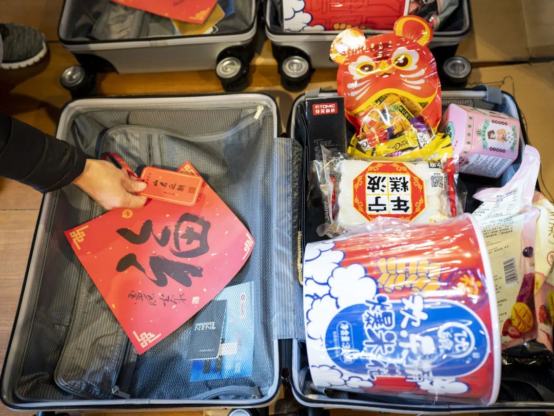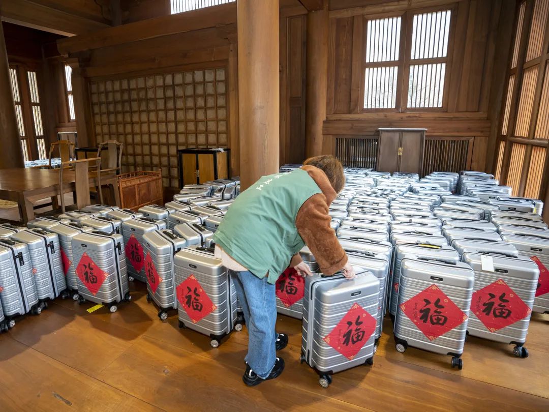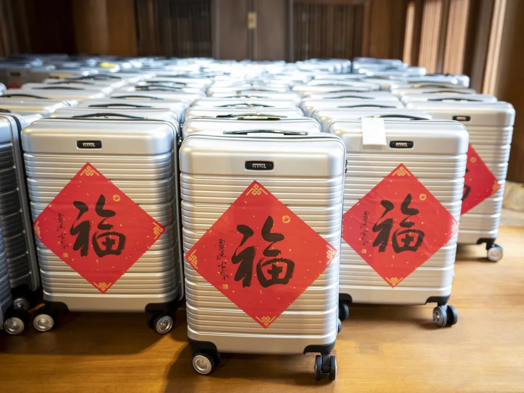 “新春福满一箱情”的慰问品包含了20寸行李箱一个、年货礼品、灵隐寺方丈光泉大和尚“福”字贴和“山君迎新”福卡,承载着新春传统的美好祈愿和祝福。