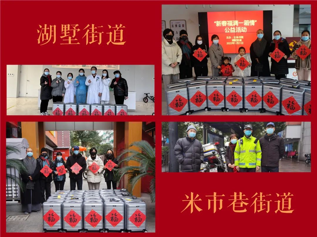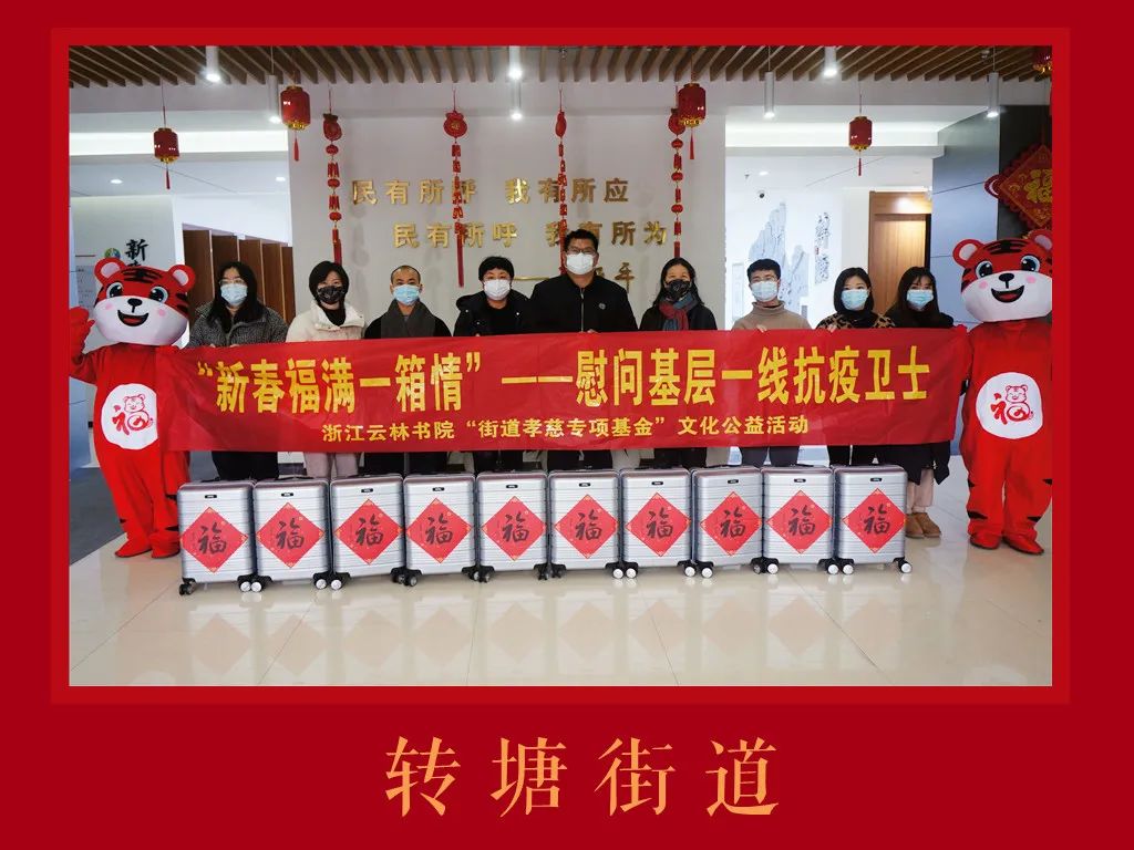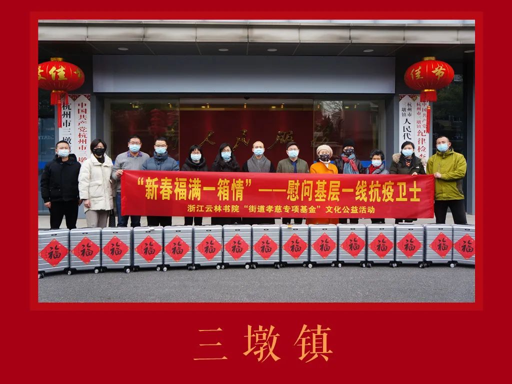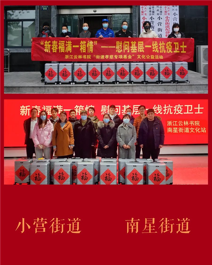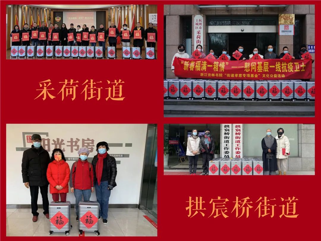 壬寅春节前夕,浙江云林书院启用2021年度第五届“云林公益书画联展”结缘款项所设立的“街道孝慈专项基金”,联合各街道社区、上海高铁旅游服务有限公司共同发起“新春福满一箱情”文化公益活动,慰问了210位一线抗疫先进个人,送出福气满满的暖心年货,以此表达对该群体的敬意与感谢。