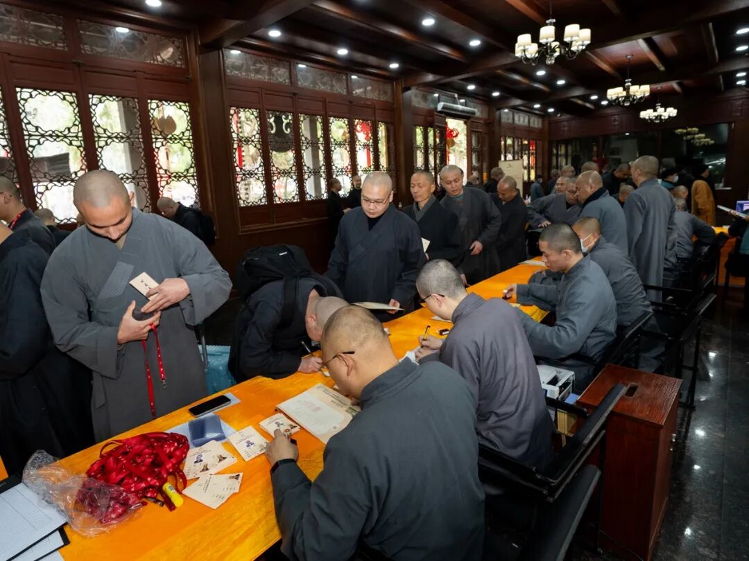 9日,前来灵隐寺求戒的戒子们,在引礼师的带领下,依次登记个人信息,接受行李检查和五堂功课的考核以及健康检查,领新戒证,将通讯工具及个人贵重物品寄存到常住,领取戒期所需的衣、钵、具等物品,欢喜入单。