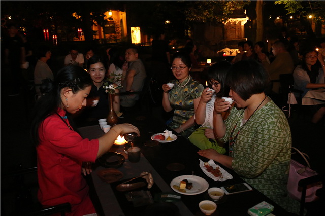 另一边,手中捧着法师、茶人用心泡出的茶,大家的身心随着茶叶渐渐舒展开来,用心感悟这茶中三昧。化解戾气,成就和气,这是一杯感恩的茶;茶叶片片,以甘香融入清水,润泽人我,这是一杯包容的茶。减一分私欲,增十分温馨,这是一杯分享的茶;为茶而来,为法而来,为缘而来,这是一杯结缘的茶……