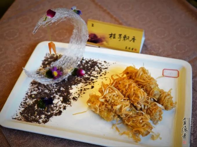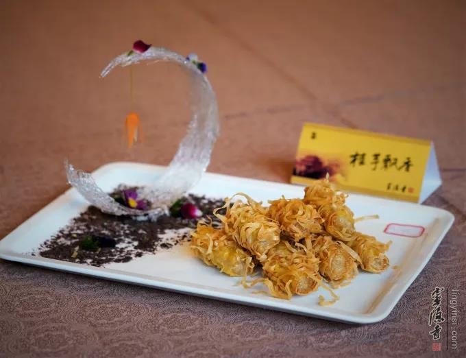 马兰头清洗干净过水捞出备用。笋丝、香干切丝过油和马兰头拌一起,用油豆皮包好卷起,卷上手工面过油炸金黄,捞出控油,装盘即可。