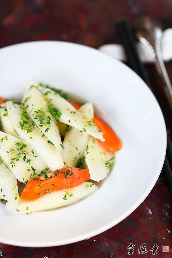 4.胡萝卜斜刀切成薄片;