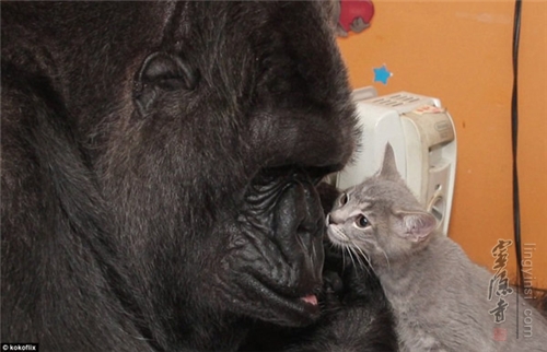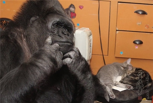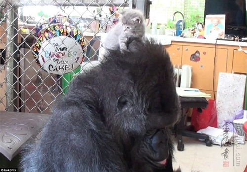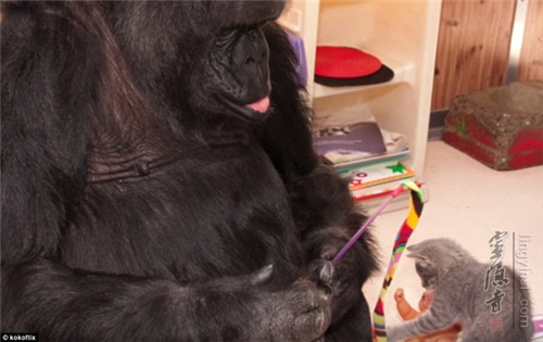 美国加州一只叫"可可"的雌性黑猩猩是个明星,她学会了大量美国标准手语。为了庆祝可可44岁的生日,训练员让可可领养了两只小猫当孩子。