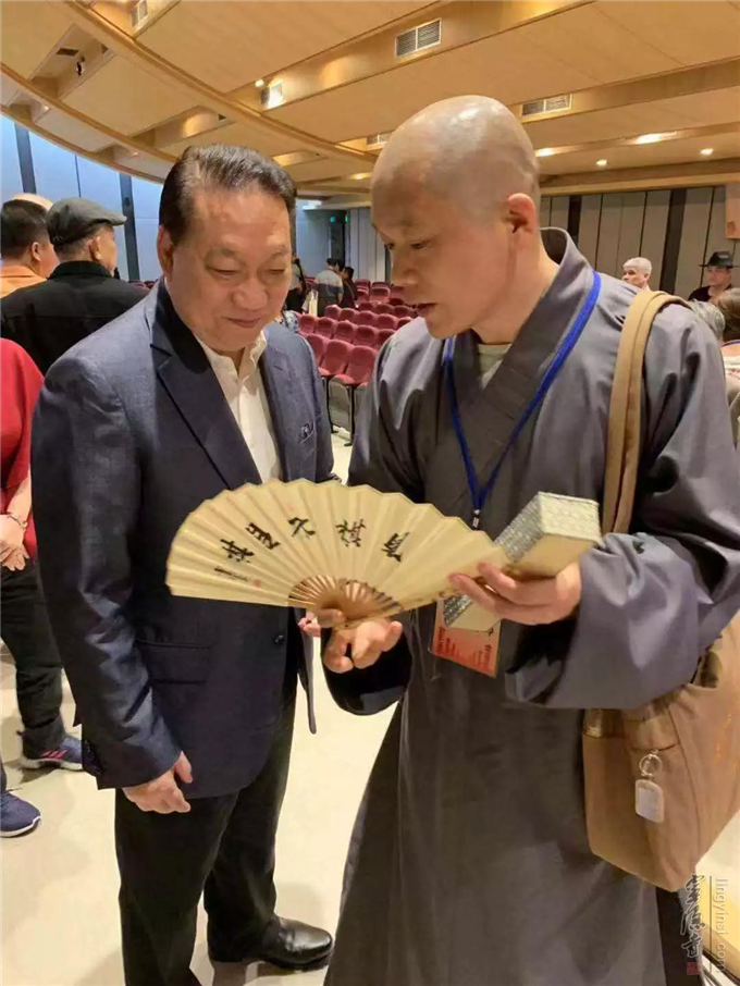 灵隐寺围棋队领队觉亮法师与炎黄杯发起人正大集团副董事长莱绪峰亲切交谈 赠送礼物