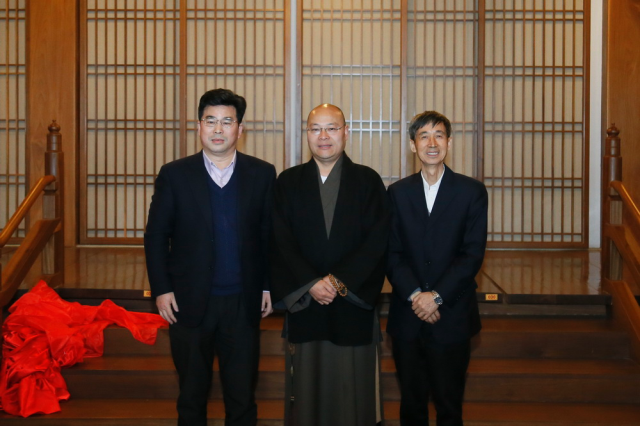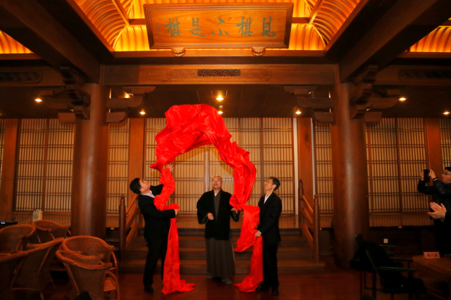 中国围棋协会主席王汝南、浙江省体育局局长孙光明和杭州市佛教协会会长、灵隐寺方丈光泉大和尚,在邀请赛前共同为大和尚亲笔的"见棋不是棋"揭匾。