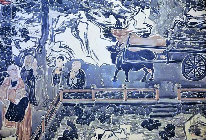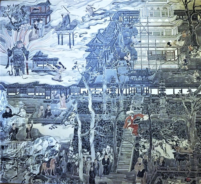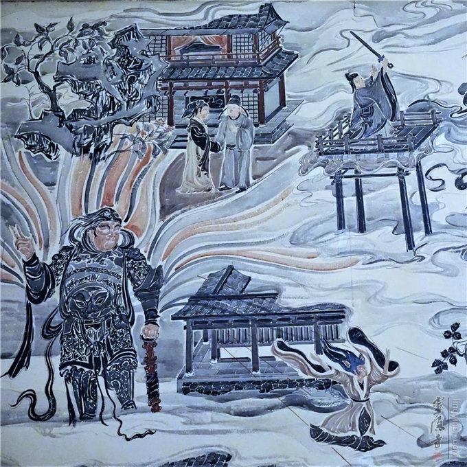 第七幅壁画说济公发愿重修大悲楼。济公来到天王殿,看见韦驮神像威仪,甚为可观。有诗为证: