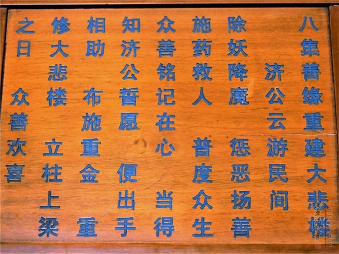 济公云游民间,降妖除魔,惩恶扬善,施药救人,普度众生。众善铭记在心,当得知济公誓愿,便出手相助,布施重金,重修大悲楼。立柱上梁之日,众善欢喜。