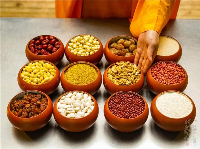 灵隐寺腊八粥的食材,要用上12种:花生、红豆、莲子、桂圆、红枣、蜜枣、芸豆、白果、糯米、大米、桂花、白砂糖。